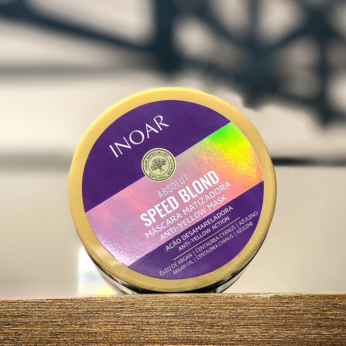 Maska Absolut Speed Blond niweluje żółty odcień włosów. Ma fioletowe